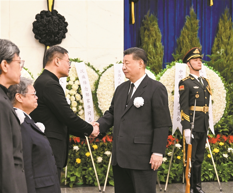 上午9时30分许,习近平、李强、赵乐际、王沪宁、蔡奇、丁薛祥、李希、韩正等,在哀乐声中缓步来到邹家华同志的遗体前肃立默哀,向邹家华同志的遗体三鞠躬,并与邹家华同志亲属一一握手,表示慰问。