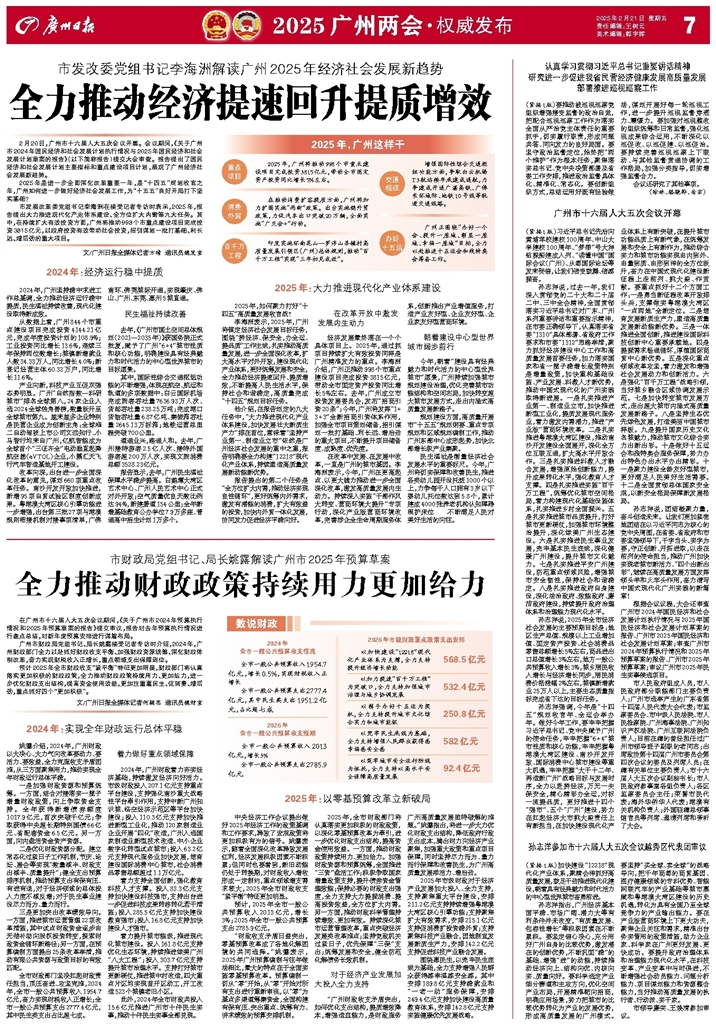 - 全力推动经济提速回升提质增效 2月20日,广州市十六届人大五次会议开幕。会议期间,《关于广州市2024年国民经济和社会发展计划执行情况与2025年国民经济和社会发展计划草案的报告》(以下简称报告)提交大会审查。报告提出了国民