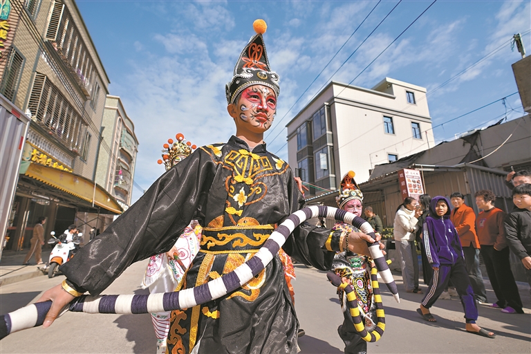 节目演毕,各支文娱表演队伍按照既定顺序和路线进行游演。县城的主干道上,早晨八九点就开始有人守候在十字路口,期望一睹游演风采。一般来说,在开阔的十字路口,游演队伍还会稍微露两手表演一番。当地人都会满怀期待地站在道路两侧驻足观赏,不会闯进路中阻碍巡游队伍行进。