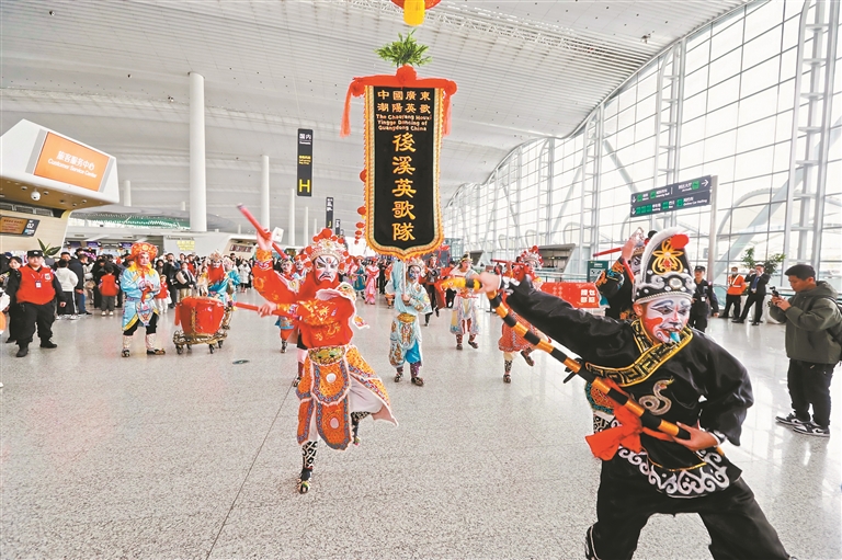 白云机场还在航站楼举办了醒狮表演,锣鼓喧天,热闹非凡;英歌舞、杂技、民乐演奏等文化活动轮番上演,为旅客带来了视觉与听觉的双重享受。旅客刘先生为了多看两眼非遗英歌舞表演,从T1航站楼一直追到T2航站楼,看完直呼过瘾:“英歌舞太火了,都上了春晚,我还一直没机会线下观看,这次有幸在白云机场看到,真的精彩,太开心了!”