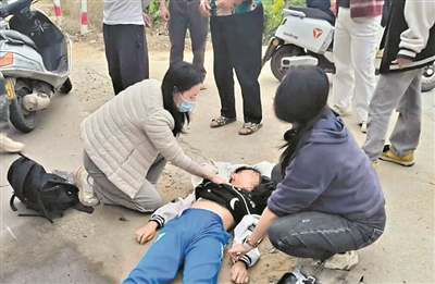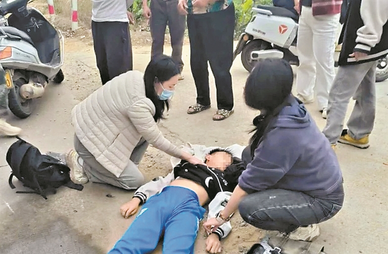 姐妹俩一听,车刚刹停就打开车门冲了下去,只见受伤的男学生仰躺在地上,面色苍白,对旁人的呼喊没有任何反应。见此,吴文婷跪地俯身实施紧急检查,手指触到其后脑勺时,掌心传来了黏腻触感,血肿已鼓胀如鸡蛋大小。