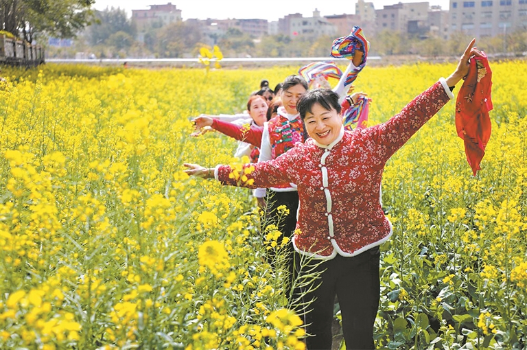 广州日报讯 (全媒体记者汤南 通讯员党英伟)近期,广州市白云区龙归街南村村的油菜花进入盛花期,金黄色的花海为古朴的村落增添了一抹亮丽的色彩,吸引不少市民前来打卡拍照。