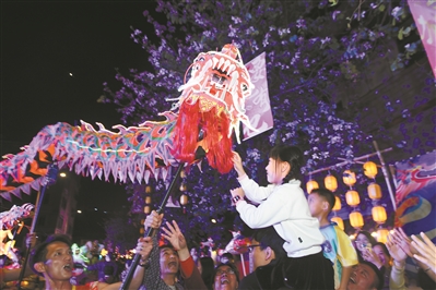 朱紫街主道上,一条长达168米的巨型金龙蜿蜒腾跃,龙头与龙尾采用非遗扎花灯工艺,每位前来“游朱紫”的市民都感受到“龙抬头”气势。朱紫街内还设置诸多打卡点,“孖仔阁”寓意着日子红红火火,好事成双;“埕墙”(粤语谐音“情墙”),更是让成双成对的恋人们流连忘返。现场设置了宋潮雅集时尚文创区、非遗摊位区,文创产品、木版年画、扎狮头等物品琳琅满目,让市民游客一站式体验佛山丰富多彩的传统及新潮文化。