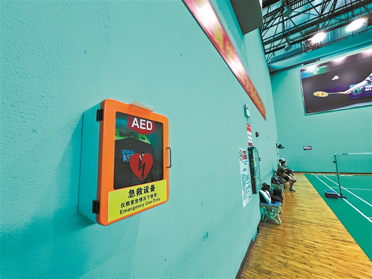 记者随后走访了荔湾区体育馆,看到羽毛球场旁边就配置了AED,工作人员表示,他们都要求学习急救知识和会用AED。