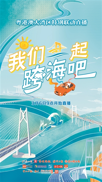 3月6日,广州日报联动香港商报、澳门日报、深圳报业集团、珠海特区报、东莞日报、中山日报、江门日报等粤港澳三地媒体发起《我们一起跨海吧!》大型直播,分两路直播车开启全程8小时直播的穿桥跨海之旅。直播过程将穿行南沙大桥、虎门大桥、深中通道、港珠澳大桥、黄茅海跨海通道等粤港澳大湾区跨江跨海通道,探访广州、香港、澳门、深圳、珠海、东莞、中山、江门等大湾区城市的多处高质量发展一线,从中体会大湾区建设的壮阔浪潮,感受大湾区“路相连、人相通、心相融”的融合面貌,领略向春天出发的澎湃活力和强劲力量。