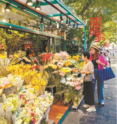 在越秀区北京路片区,46个示范点,让这个繁华区域树木葱茏。在北京街广府文化会馆附近,小东营广场设置了一处绿化景观,与周围的红楼青瓦相得益彰,广场出入口更是采用吊篮绿植的形式“见缝插绿”,为社区绿化添彩。从中山四路拐进北京路,走上几步就会发现一处花卉集中展销宣传区,各色花朵争奇斗艳、芬芳阵阵;继续走下去,可以看到盐运西社区居委会门口的箱式绿植郁郁葱葱,二楼还有绿植垂下,枝叶随风摆动。北京路既是人口密集的老城区,又是人潮涌动的旅游地,广州因地施策,深入挖掘植绿空间,探索了社区绿化与产业融合的新路径,又以绣花功夫回答了“何处开展、怎样布局”的关键问题。