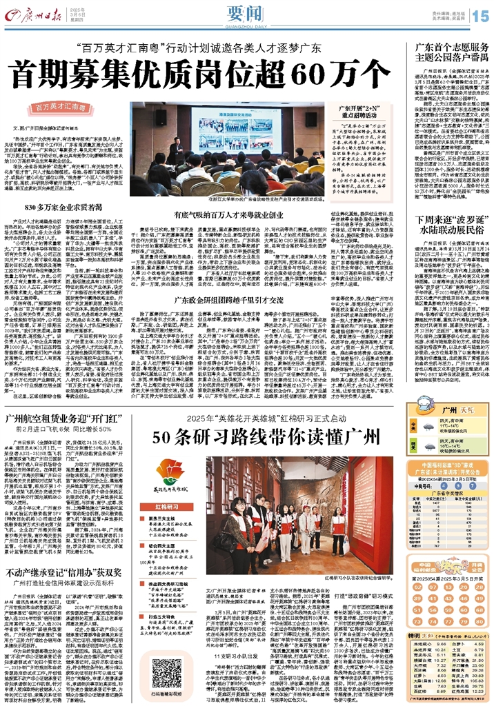 - 首期募集优质岗位超60万个 百万英才汇南粤 文、图/广州日报全媒体记者何颖思 “热忱欢迎广大优秀学子、有志青年前来广东实现人生梦、见证中国梦。”开年首个工作日,广东省高质量发展大会向人才发出诚挚邀请——广东将以“粤聚