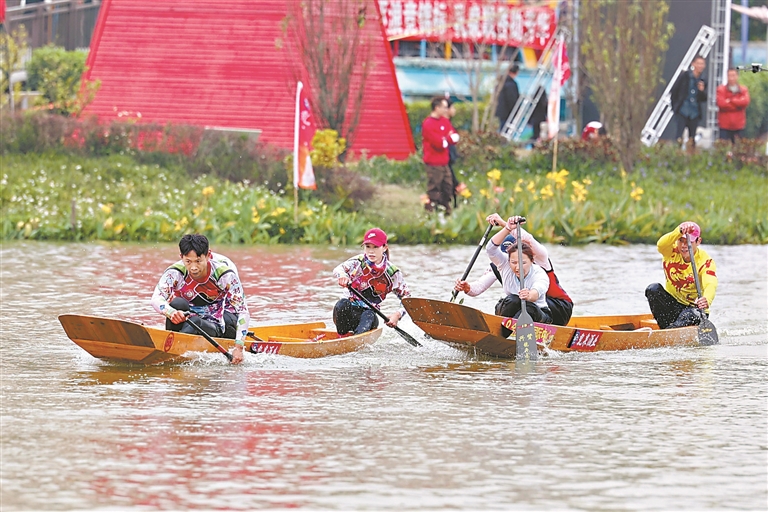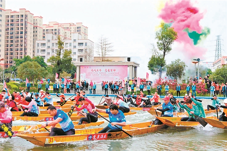 作为佛山市2025年“三八妇女文化月”活动之一,3月8日,“龙凤呈祥 竞速紫南”——2025年佛山市妇联三人龙凤草艇大赛在紫南文化旅游区“紫南船说”水上游河道举行。