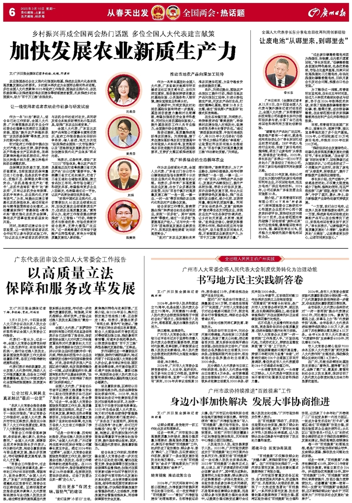 - 加快发展农业新质生产力 文/广州日报全媒体记者李晓璐、赵越、邓潇丽 农业强国是社会主义现代化强国的根基,推进农业现代化是实现高质量发展的必然要求。乡村振兴再次成为全国两会期间热点话题,多位全国人大代表聚焦2025