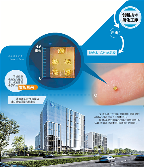 2023年,艾佛光通在广州知识城的总部基地启动建设,预计今年7月整体完工。届时,基地的滤波芯片年产量将达到25亿颗,极大满足各类5G设备客户的需求。“公司2024年的营收预计是2023年的3倍,等到知识城的基地投产,公司效益还将出现更大幅度提升。”