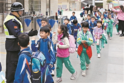 放学时分,校园里热闹非凡,也是肖祝军最忙碌的时候。他紧紧盯着每一个走出校园的孩子,一旦发现有学生在校外逗留,便立刻上前,微笑着轻声提醒:“小朋友,外面车多不安全,回学校等家长来接哦。”对于家长未到的学生,他更是格外留意,保证他们在校园内安全等候。