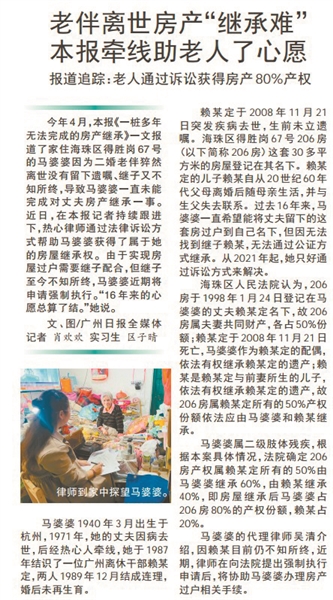 今年1月23日,海珠区侨联法律援助中心和林淑菁律师赴海珠区不动产登记中心为马婆婆完成不动产登记申请工作;2月26日,当律师团队把崭新的房产证交到马婆婆手中时,老人眼含热泪:“我做梦都盼着这一天。”