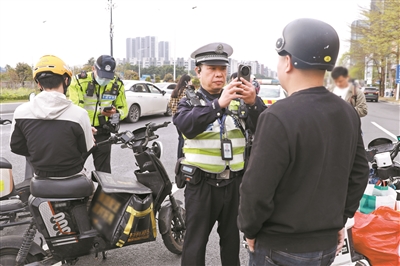 广州日报讯 (全媒体记者张丹羊)正在开展的全市电动自行车重点违法行为整治行动中,广州交警严查涉牌、骑乘人员不戴头盔、闯限行等交通违法行为。3月13日早高峰时段,在位于车陂南隧道北往南出口附近的查车点,十余名电动自行车驾驶人因闯限行被执勤交警查处。