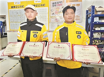 广州日报讯 (全媒体记者章程摄影报道)近日,两名外卖小哥凌晨在广州海珠琶洲大桥救下一名轻生女子引发广泛关注。事发两天后,广州市见义勇为基金会理事长、秘书长等人专门来到两名外卖小哥工作的美团琶洲配送部站点,为他们送去慰问奖励证书以及慰问金等。美团为两人颁发了“先锋骑手”奖励。