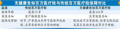 记者对比相关资料发现,传统的百万医疗险有严格的健康告知,结节、严重高血压等既往症可能被除外或者拒保,同时最高投保年龄只能到65岁或70岁。而近年来受到消费者关注的免健康告知百万医疗险的投保年龄最高放宽至105岁,这意味着高龄人群也有机会投保,投保过程更加简单。