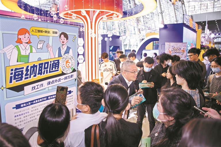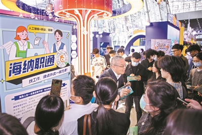 除了设有传统技艺展示窗口让应聘者参与互动体验,“广州大道”还汇聚了代表中国尖端科技的“硬核实力”。只见“海马”号无人遥控潜水器端坐展台,别看它其貌不扬,它可会下深海采样。作为我国自主研发的首台4500米级深海遥控作业潜水器,“海马”号国产化率超90%,创下多项国产深潜器作业纪录。“我们国家目前在深海科技领域已经走在世界前列。其实对于很多大学生来说,这是一个机会。”广州海洋地质调查局深海遥控潜水器工程师梁永志说,“这是一个面向全国大学生的学习、就业、创业的平台,机械、生物、化学、地质……不同专业的学生都可以来到广州,共同探索深海科技的深度。”