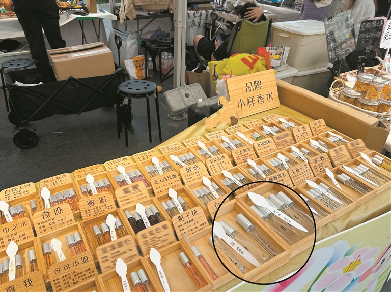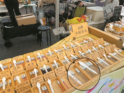 而在线下,分装化妆品也屡见不鲜。记者走访了市内一些集市,不少摊位都在销售“品牌小样香水”,原价一瓶上千元的品牌香水,在这里可能100元都不用。一位摊主介绍,这些小样都是自己买来大牌香水进行分装的:“是自灌进去的,完全可以放心。69元一瓶,一瓶15ml,买二送一。”