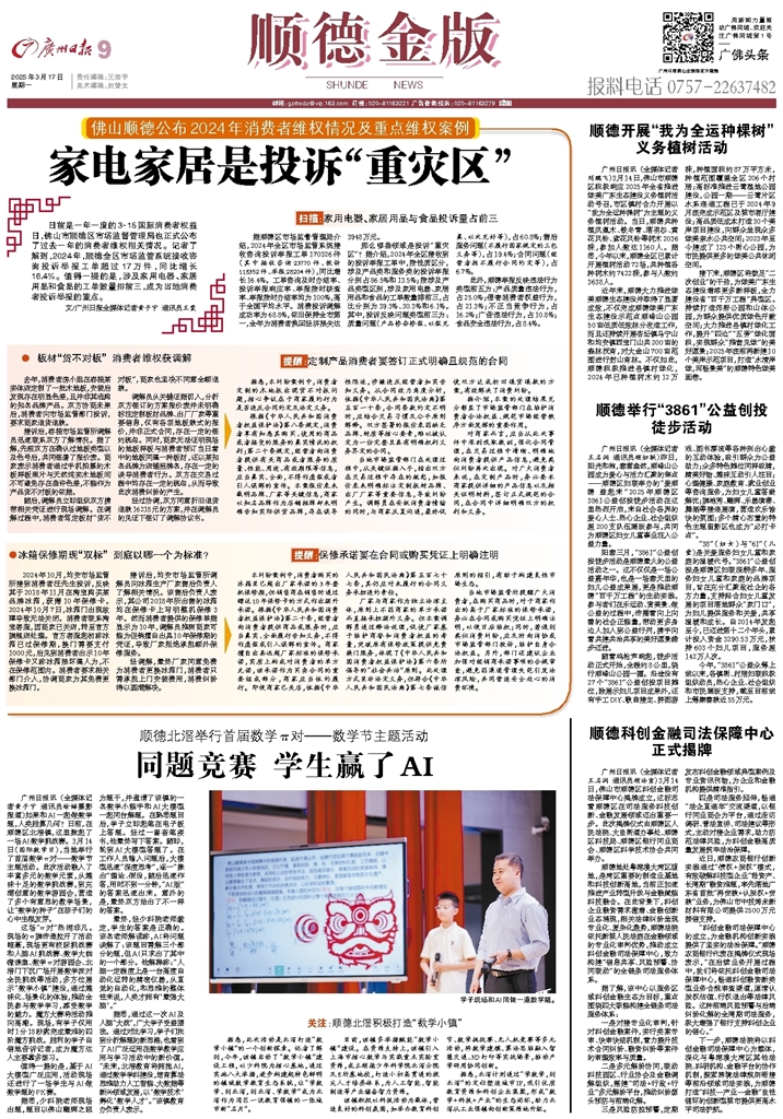 - 家电家居是投诉“重灾区” 日前是一年一度的3·15国际消费者权益日,佛山市顺德区市场监督管理局也正式公布了过去一年的消费者维权相关情况。记者了解到,2024年,顺德全区市场监管系统接收咨询投诉举报工单超过17万件,同比增长