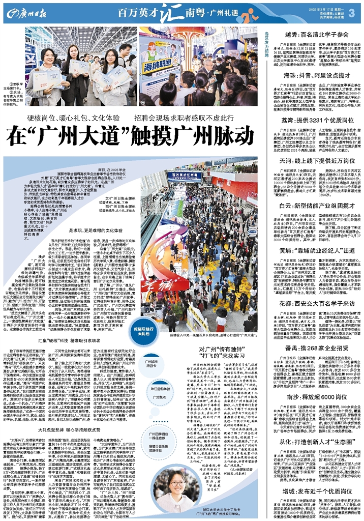 昨日,在2025年全国城市联合招聘高校毕业生春季专场活动启动仪式暨“百万英才汇南粤”春季大型综合招聘会现场,入口处一条逾百米长的花路,吸引着众多应聘学子的目光。这是广州为本场大型人才“嘉年华”精心