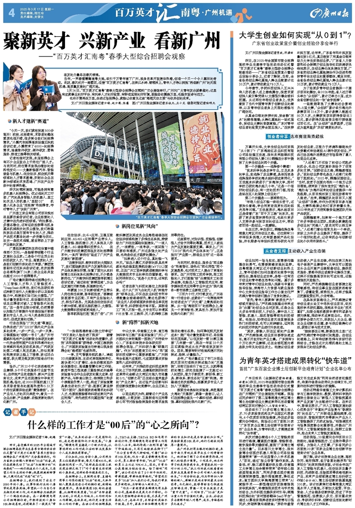 - 什么样的工作才是“00后”的“心之所向”? 记者手记 文/广州日报全媒体记者丁雄、赵越 昨日,备受瞩目的2025年全国城市联合招聘高校毕业生春季专场活动启动仪式暨“百万英才汇南粤”春季大型综合招聘会在广州琶洲广交会展馆举行。作为首批