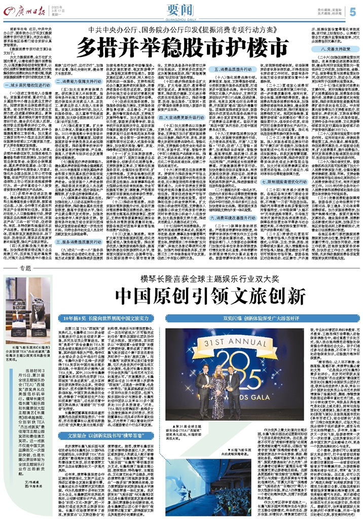 - 中国原创引领文旅创新 当地时间3月15日,第31届全球主题娱乐协会(TEA)“西娅奖”颁奖典礼在美国洛杉矶举行。横琴长隆凭借长隆飞船乐园和长隆原创大型主题演艺《长隆秀》的卓越表现,分别斩获TEA“杰出成就奖”最佳海洋主