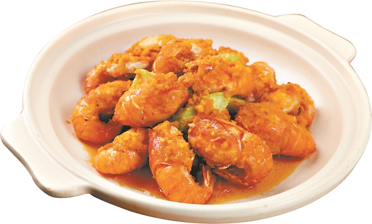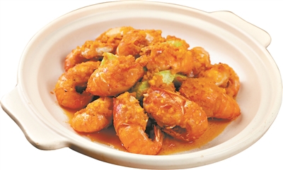 记者翻开菜单,发现粤菜与日本料理最大的不同,在于菜单上的菜肴种类繁多。广州酒家厨艺“第六代传人”代表麦展飞告诉记者:“仅基本菜单上就有 100多种菜品,而且会随着季节变化而有很大变化。尽管变化速度很快,但大虾料理已经流行了20年。”紧接着,麦师傅带记者参观了厨房。宽敞的厨房干净整洁,炊具摆放整齐。一位年轻的厨师正在大锅里炒菜,火苗冉冉升起,他们在做的便是招牌菜“霸王酱焗罗氏虾”——将咸蛋黄和韭菜油放入搅拌机中搅拌至泥状,然后加入调味料制成酱汁;罗氏虾切去虾腿,剖开虾肚,用沸水祛除杂味,然后放入150℃的油中炸至外壳酥脆;在酱汁中加入黄油,用小火加热,然后放入大虾翻炒。麦师傅指出这道菜的“技术难点”:“如果火太大或者太小,味道都不好。”厨师一边有节奏地煎炸食物,一边用脚下杠杆调节燃气灶的火力,大约10分钟后,这道金黄色的美食就做好了。粤菜烹饪最讲究食材的口感和新鲜程度。正如麦师傅所言,大虾清淡爽口,口感极佳,令人愉悦。蛋黄酱香甜浓郁,但也能品尝到大虾的鲜甜。