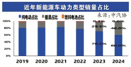 高压快充技术加速普及的背景之一,是纯电动车销量增长不及插混。据中汽协统计,2024年国内纯电动汽车销量占新能源汽车比例为60%,但较2023年下降10.4个百分点;插混汽车销量占新能源汽车总体销量40%,但较2023年提高10.4个百分点。