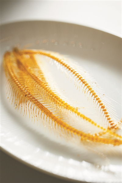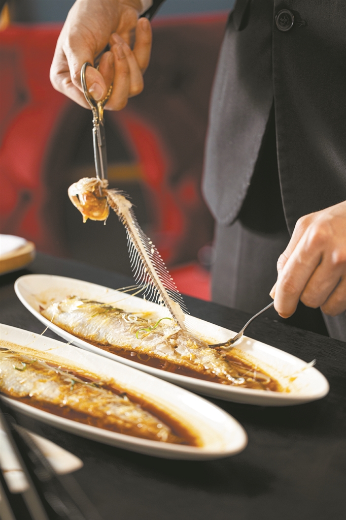 与耘景里不同,炳胜在刀鱼的制作上则更加注重别样风味。“葱油蒸刀鱼和椒盐刀鱼鱼骨,是我们餐厅对刀鱼‘本味与再造’的双重诠释。”炳胜负责人告诉记者,葱油蒸刀鱼传承粤菜“大味至简”的哲学,以传统清蒸技艺为基底,再配以秘制葱油提鲜提香,入口香鲜,能更好地突显刀鱼清甜本味。而椒盐刀鱼鱼骨,则是针对刀鱼骨细软的特性,将鱼骨酥炸后佐以椒盐,酥香口感,十分符合年轻客群偏好。
