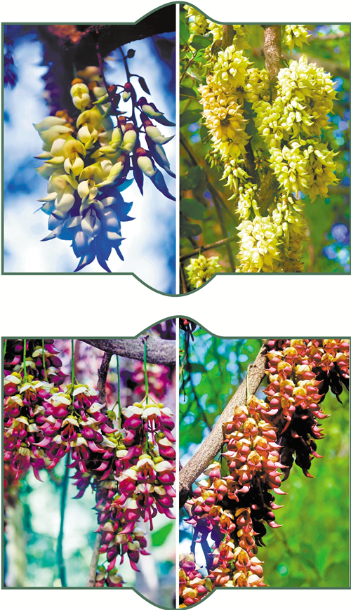 禾雀花向上攀爬的能力极强,好像一条巨蟒盘绕在大树上。每朵花都像一只小鸟,簇串状花穗直接长在藤蔓上,盛开时,古藤老树下挂满禾雀花,就像一群禾雀鸟藏身在花藤中,有“藤缠树兮花似雀”之称。