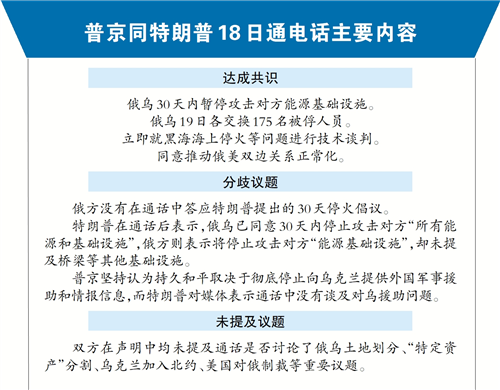 据克里姆林宫和白宫消息,双方在通话中取得一定共识,主要有:俄乌30天内暂停攻击对方能源基础设施;俄乌19日各交换175名被俘人员;立即就黑海海上停火等问题进行技术谈判等。