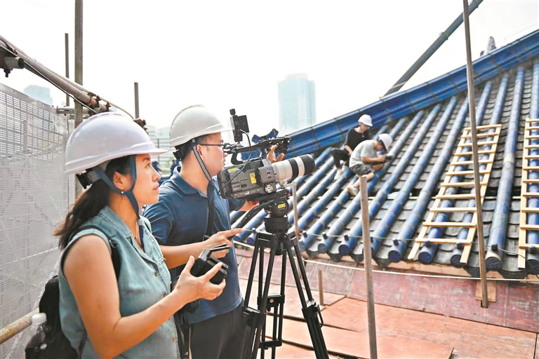 “这次纪录片关注的是不可移动文物——古建筑。可移动文物和不可移动文物之间的修缮有很大的区别,这不是一般意义上人们理解的工匠们精雕细刻的过程,它更偏重于工程施工和材料的选择。另外古建筑是静止的,穿梭于其中的各种各样的人,比如过往的人,参与修缮的专家、施工团队、摄制组、游览的市民等,他们是变化和流动的。当然,建筑也只有和人发生了关系,它才是鲜活的,才能够进入到当代社会和文化语境中。”回望《华堂焕彩》的成片过程,李嘉透露,大家需要的是耐心,“大部分的拍摄是在屋顶上的工地完成的,摄像组要像工人们一样,戴着安全帽、保护衣、安全绳,爬工程梯。七八月份的时候,天气炎热,瓦面的温度特别高。下完雨,琉璃瓦特别滑。这些都是摄制组要克服的。而且屋面脚手架的通道空间很有限,空间的限制使得摄像机的调度困难很大。此外,建筑本身的拍摄难度也很大,天气是不可控的,想拍摄建筑的日出、晚霞、剪影,都要等天气,是一个很需要耐心的过程,这倒是很符合纪录片创作的特点,忠实于记录。”