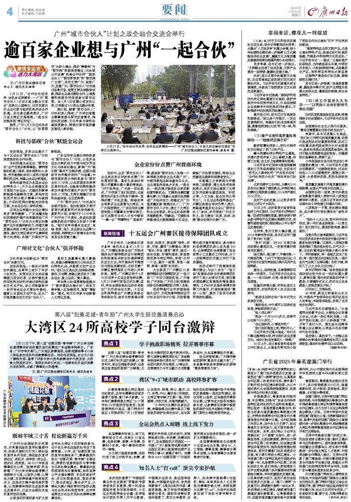 3月21日,“合作合伙创未来·全民全运更精彩——广州‘城市合伙人’计划之政企融合交流会”在珠江公园举办,近百名国内外企业代表与政府机构共话合作机遇。多位参会嘉宾表示,广州乃至大湾区天高海阔,一起合伙定能实现“湾区好运”。