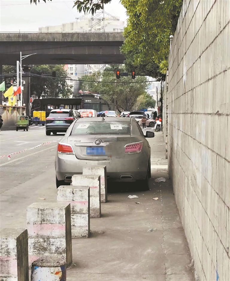 广州日报讯(全媒体记者张慧琪摄影报道)近日有住在白云区江南市场附近的居民反映,在江南市场一号门前的道路边,长期停放着一辆布满灰尘的车辆,致使行人和非机动车经过时只能往道路中间的机动车道变道,险象环生。