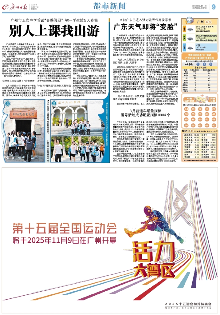 - 别人上课我出游 广州日报讯 (全媒体记者林欣潼、谢泽楷)昨日早上,广州市玉岩中学的310名初一学生在学校的组织下,前往中山、珠海两地开展3天2晚的研学实践活动。加上周末,同学们迎来了为期5天的“春季假期”。