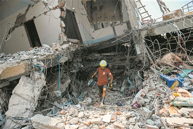 ▶3月29日,在缅甸曼德勒,一名救援人员在建筑废墟中搜救。 新华社发