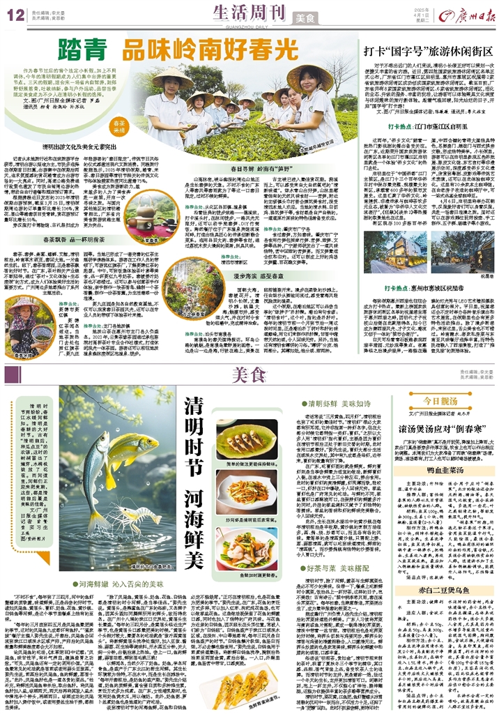 - 踏青 品味岭南好春光 作为春节过后的首个法定小长假,加上不用调休,今年的清明假期成为人们集中出游的重要节点。三天的假期,适合来一场省内自驾游,到郊野舒展筋骨,吐故纳新,参与户外运动,品尝当季限定美食成为不少人在清明小
