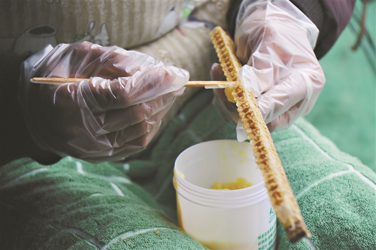 陈桂成平常需要定期收取蜜糖和蜂王浆,还要定时检查蜜蜂的情况。虽然日常一般无须喂养,但在寒冬无花等特殊时期,他们还是要为蜜蜂提供足够的食物和水源。