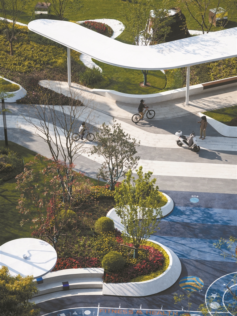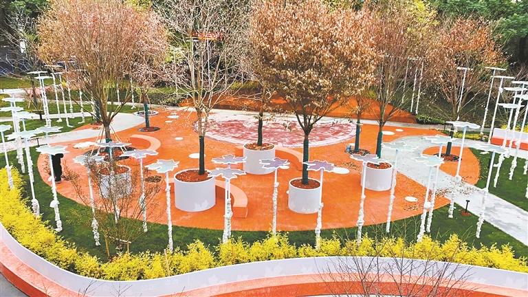 贻贝(上海)景观规划设计有限公司艺术总监李昆带领团队将场地最高点改造为丘陵状儿童游戏区,既解决了高密度城区绿地排水难题,又让起伏的地形成为连接不同年龄层居民的纽带。“镜面廊架倒映着苏州河的波光与往来人群,铸钢雕塑《印迹》留下了历史的记忆。儿童活动区以‘宇宙空间’为主题,通过八大行星模型和互动装置,将科普融入游戏。”李昆告诉记者,面对高楼遮蔽的养护困境,项目突破传统绿化模式,选用海棠、三角枫等,搭配花境植物营造“春天海棠花开,秋天红叶片片”的植物意境。