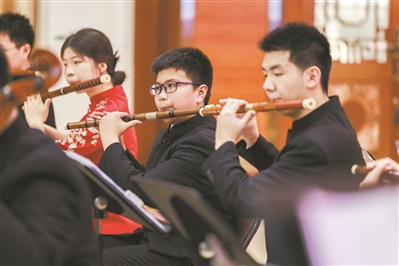 当天,该乐团正在排练《唱支山歌给党听》曲目。排练的时候,初二年级的男同学在击打扬琴,明亮悠扬。乐团最后一排的三位同学要在锣、钹、定音鼓、小军鼓、大军鼓等多种乐器间切换。到目前为止,该乐团共完成区、市、省、国家比赛50余次,均获一等奖,并多次参与交流演出。