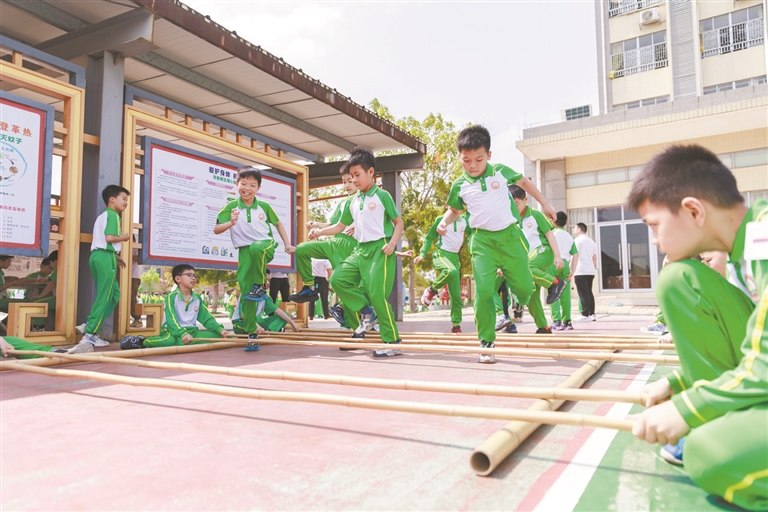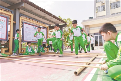 记者在广州市番禺区石楼镇清流小学看到,同学们在课间以班级为单位开展活动,参与自己喜欢的体育活动或游戏。据了解,该校设计了十多种不同的体育活动项目和游戏。除了跳绳等项目,还有跳竹竿舞、抽陀螺、滚铁环等趣味游戏,甚至有班级在课间唱歌“斗歌”。