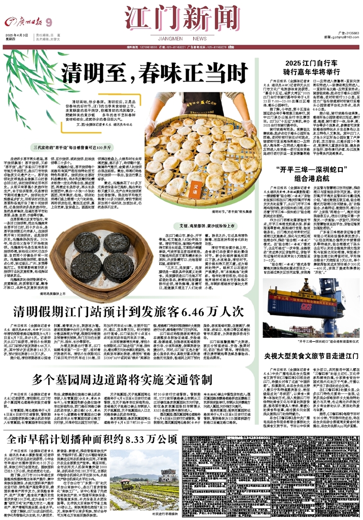- 清明至,春味正当时 清明雨细,侨乡春深。清明前后,正是品尝春味的好时节,江门的当季美食纷纷上市。皮黄酥脆的恩平烧饼,软糯清甜的鸡屎藤饼,肥嫩鲜美的黄沙蚬……多年的老手艺和春鲜食材相结合,成就侨乡的春日烟火气。 文
