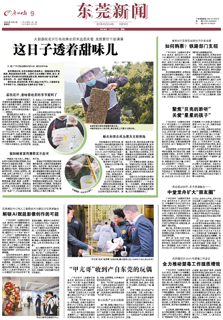 - 这日子透着甜味儿…… 文、图/广州日报全媒体记者马骏 通讯员钟雨翘 春风拂过大地,东莞大朗镇的荔枝树上一簇簇荔枝花竞相绽放,散发出淡淡的清香。记者昨日从大朗镇了解到,近日,来自四面八方的蜂农们追随着这股花香,纷纷来