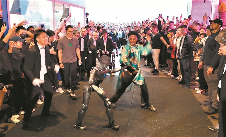 紧接着,在深圳欢乐港湾,他见到了深圳众擎机器人PM01。此前他看过众擎机器人“前空翻”视频,一直惦记着与之较量。现场,他和机器人PM01随着音乐一同舞动,将气氛推向高潮。