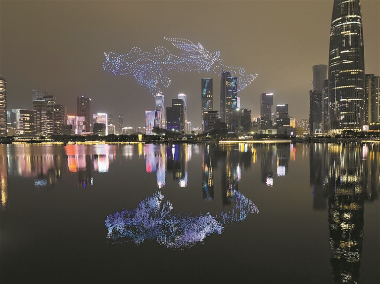 傍晚,在深圳人才公园的人才星光桥上,“甲亢哥”迎来大漠大智控提供的1500架无人机表演秀。编织出巨龙等多个形状的无人机编队在夜空中盘旋,壮观景象让他高声惊叹:“This is China!”“Amazing!”