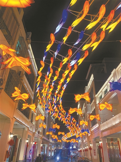 傍晚八时,记者一行走进雷州市曲街历史文化街区,古骑楼、古桥、古牌坊等历史遗迹仿佛将人们带回了“旧时光”。暮色渐浓,曲街灯明,数百米长的老街顿时流光溢彩。“哇!太美了。”游客“咔嚓、咔嚓”拍照声此起彼伏。
