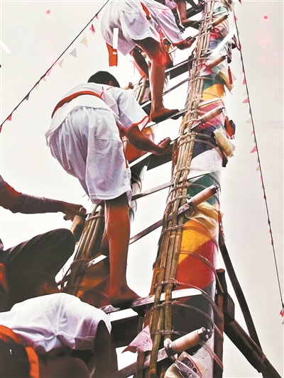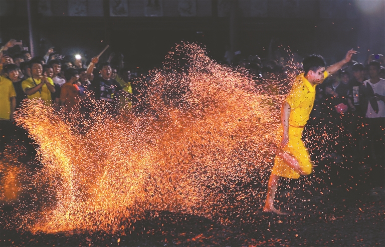 当地还有“上刀梯”与“过火海”两大民俗绝技。36把钢刀竖立成梯,赤脚攀登者如履平地,既是祭祀祈福,亦彰显无畏;后者则是元宵节祈福习俗,村民赤脚踩踏烈焰,祈求平安。从“火海”中踏过的村民说:“连‘火海’都敢踏过,往后遇到什么困难都不怕,就好像‘过火海’一样大步冲过去就行!”