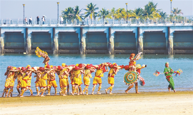 年例是粤西独特且盛大的传统民俗文化节日,至今已延续上千年。在雷州半岛有“年例大过年”之说,每至新春年例之时,各村热闹非凡,木偶戏、舞狮、穿令箭等各种古老的民俗表演接连登场,成为文化传承的载体。浩浩荡荡的巡演队伍中,东海岛东山镇东山圩村,传统人龙舞表演队伍一亮相,便赢得现场观众的欢呼喝彩。不少游客为看全6场表演,追随队伍步行2小时,足见人龙舞魅力。