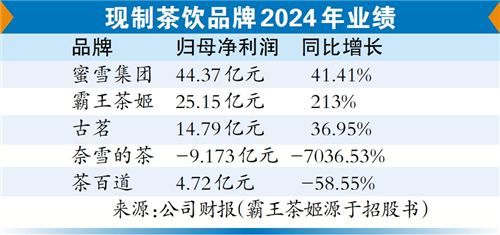 2024年,5家现制茶饮企业的营收排名分别是蜜雪集团、霸王茶姬、古茗、奈雪的茶以及茶百道,为人民币248.29亿元、124.06亿元、87.91亿元、49.21亿元和49.18亿元。