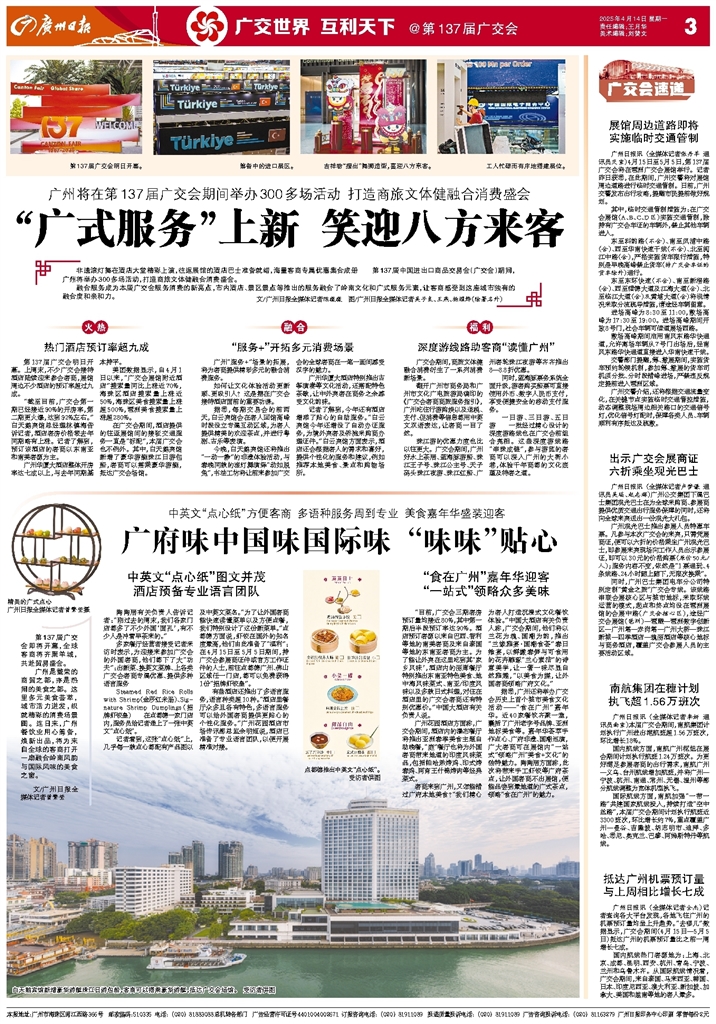 - “广式服务”上新 笑迎八方来客 非遗滚灯舞在酒店大堂精彩上演,往返展馆的酒店巴士准备就绪,海量客商专属优惠集合成册……第137届中国进出口商品交易会(广交会)期间,广州将举办300多场活动,打造商旅文体健融合消费盛会。