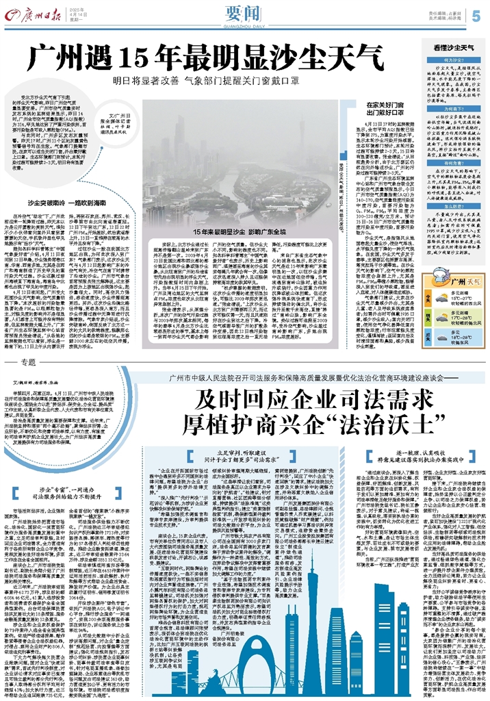 - 及时回应企业司法需求 厚植护商兴企“法治沃土” 文/魏丽娜、谢君源、张楠 羊城四月,花意正浓。4月11日,广州市中级人民法院召开司法服务和保障高质量发展暨优化法治化营商环境建设座谈会,围绕全力以赴“拼经济、保安全,办全运、提品质”工作主